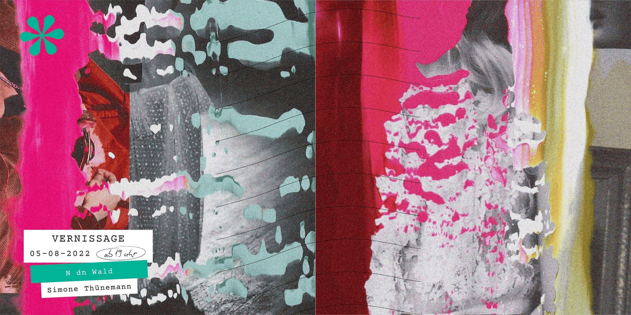 In N dn Wld bilden Collagen den Ausgangspunkt für Übermalungen, bei denen Simone Thünemann sich für Farben, die übereinander liegend verlaufen und sich verbinden oder voneinander abstoßen interessiert. Das Prinzip analogisiert ein Schichtenprinzip, welches auch der Mehrfachbelichtung in der Fotografie zugrunde liegt. Das Streichen der Farbe mit einem Spachtel erlaubt einen subjektiven bewussten Schaffensvorgang, während andererseits auch der Zufall eine Rolle spielt. Einige Stellen bleiben frei und lassen die darunter liegenden Formen der Collagen sichtbar werden, sodass sich eine zufällige Verbindung von der fließenden Farbe und den Formenteilen ergibt. Es ergeben sich individuelle Verbindungen und Situationen. Aus dem Genre der Malerei gelöst und von jeglichen Darstellungsinhalten befreit stellt die flüssige Farbe ein freies Medium dar. Die Farbenkombinationen bieten Raum für Assoziationen, während sie keinerlei Vorgaben stellen und der Vorstellung daher keine Grenzen setzen. Die Assoziationen in der Wahrnehmung des Rezipienten können sich so frei entfalten und werden nicht stets auf Wiedererkennbares rückbezogen. Wir verstehen uns als Spendengalerie. Durch den Verkauf der Bilder spenden wir einen festgelegten Anteil an einen gemeinnützigen Verein in Absprache mit den ausstellenden Künstler*innen. Die Spenden ermöglichen es, unterschiedliche soziale und nachhaltige Projekte aus aller Welt zu unterstützen - in diesem Fall gehen alle Spenden an Pan y Arte e.V.